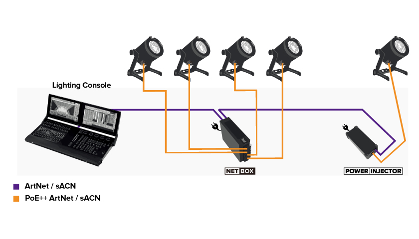 ネットボックスはアステラ製PoE++に対応したライトに電源供給、DMXコントロール、監視を一括で行う専用ネットワークスイッチです。